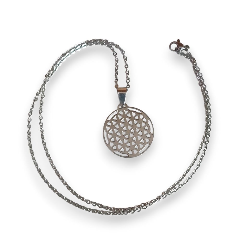 Dije Flor de la Vida de 2.5cm en acero quirúrgico con cadena de 45 0 50 cm en acero quirúrgico.