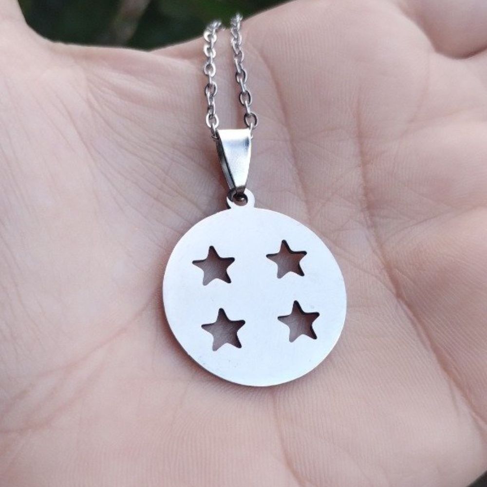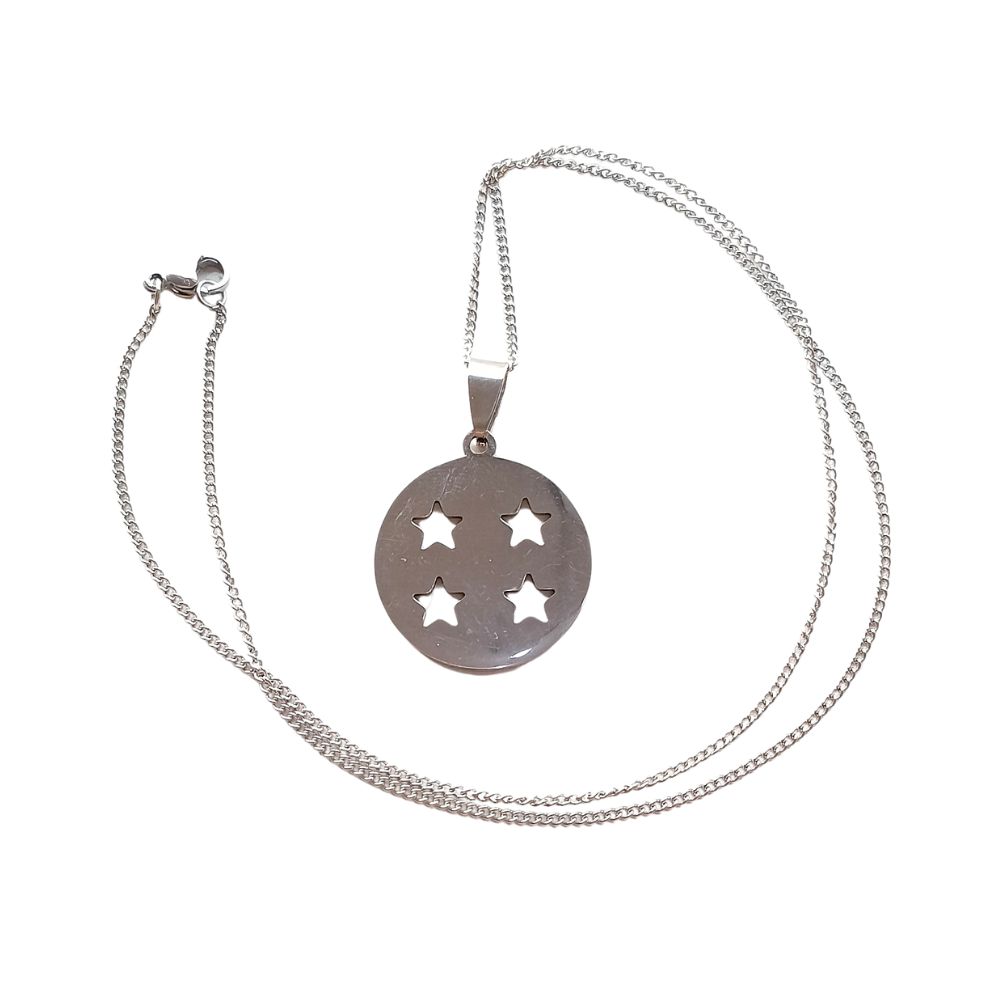 Medalla de 2,5cm de diámetro con 4 Estrellas Caladas en acero quirúrgico. Incluye cadena de 45cm o 50cm en acero quirúrgico.