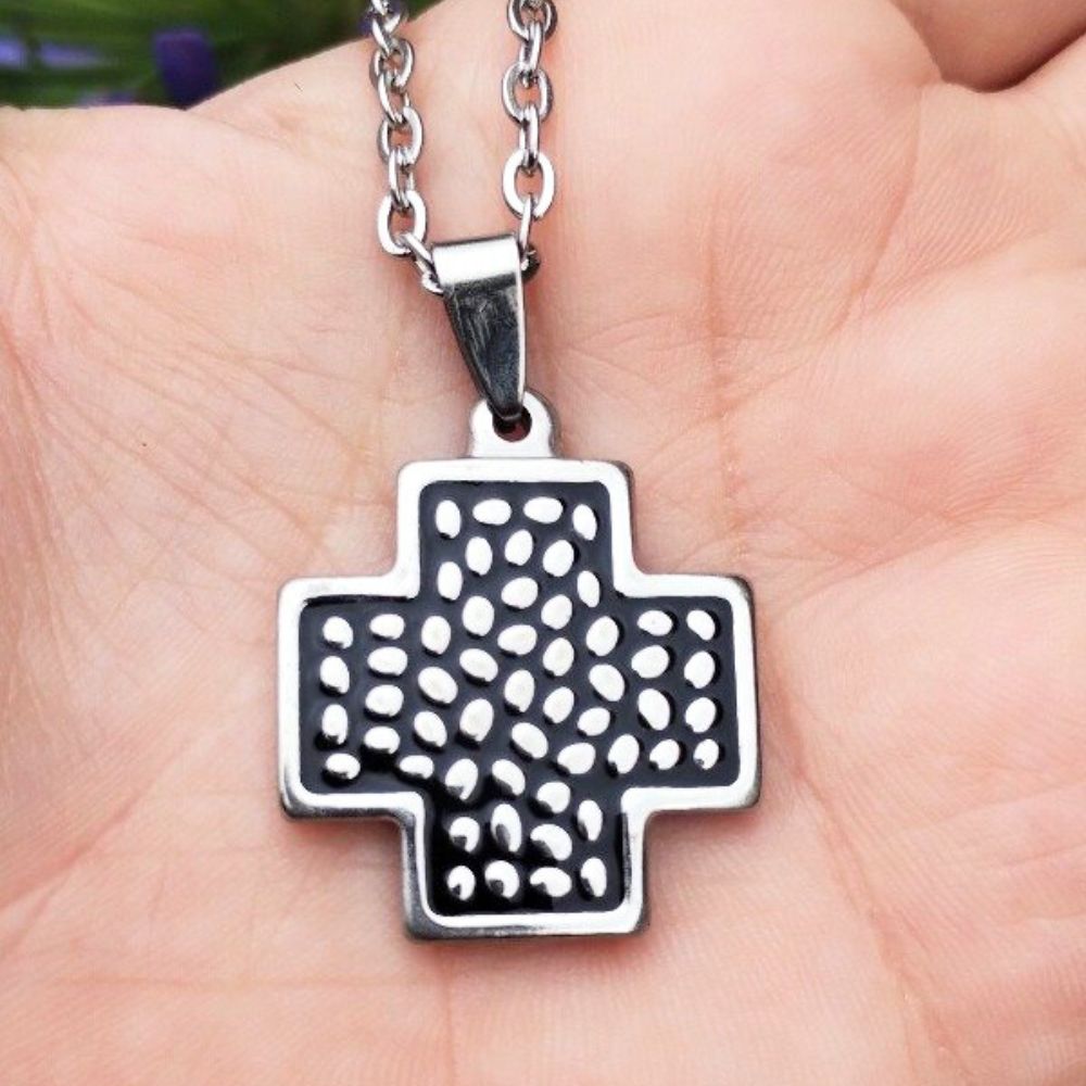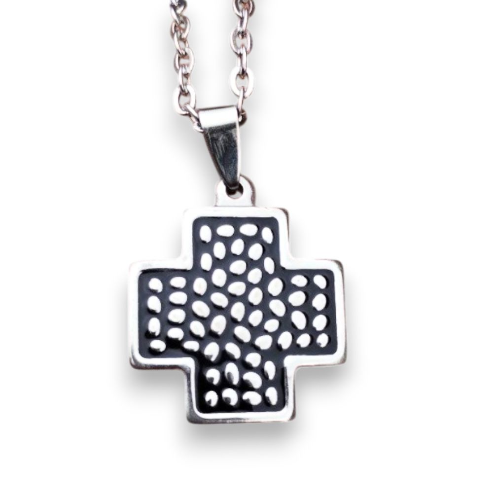 Dije Cruz de 2,5cm en acero quirúrgico con cadena de 45cm o 50cm también en acero quirúrgico.