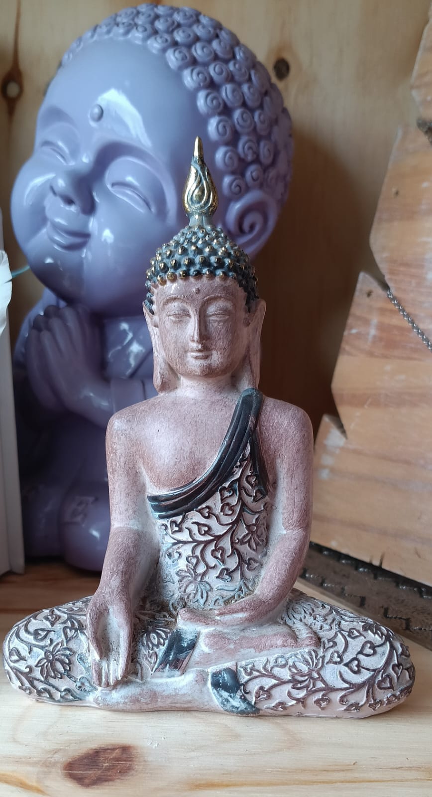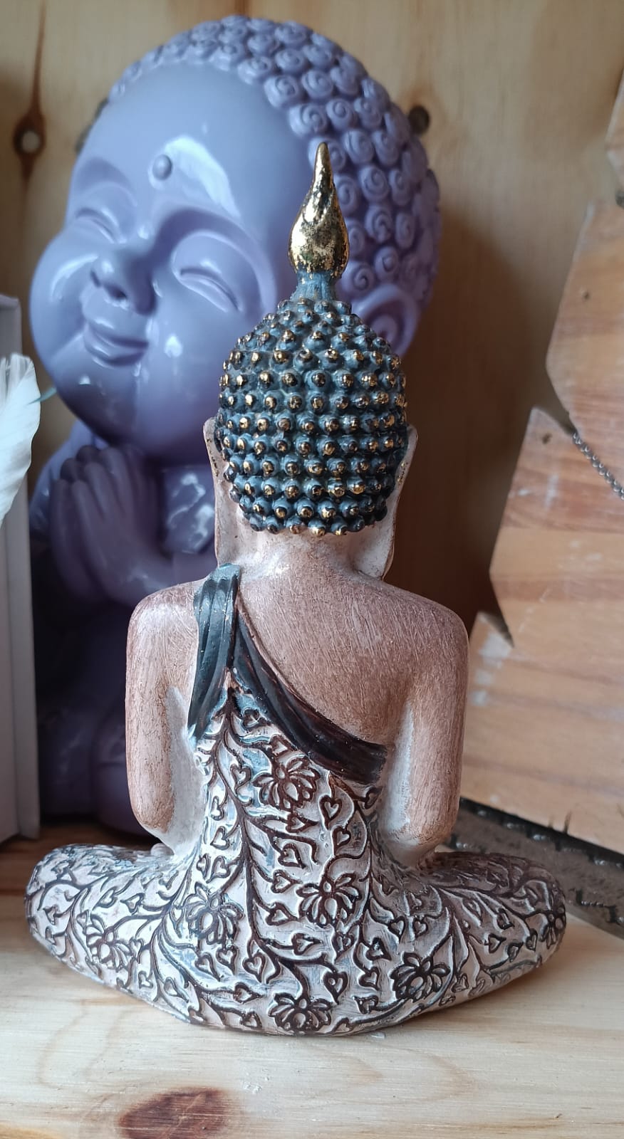 Imagen Buda 13cm importada. El diseño del manto es en relieve.