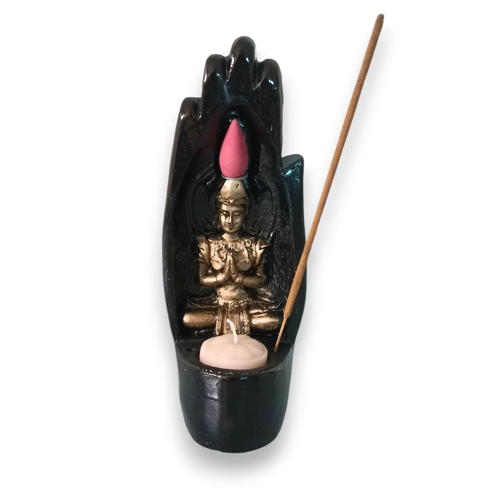 Esta fuente representa la protección, serenidad y guía espiritual del Buda, resguardado en el interior de una mano sagrada. El diseño combina el gesto de bendición y el flujo del humo descendente, evocando la energía del desapego, la paz interior y la iluminación.
