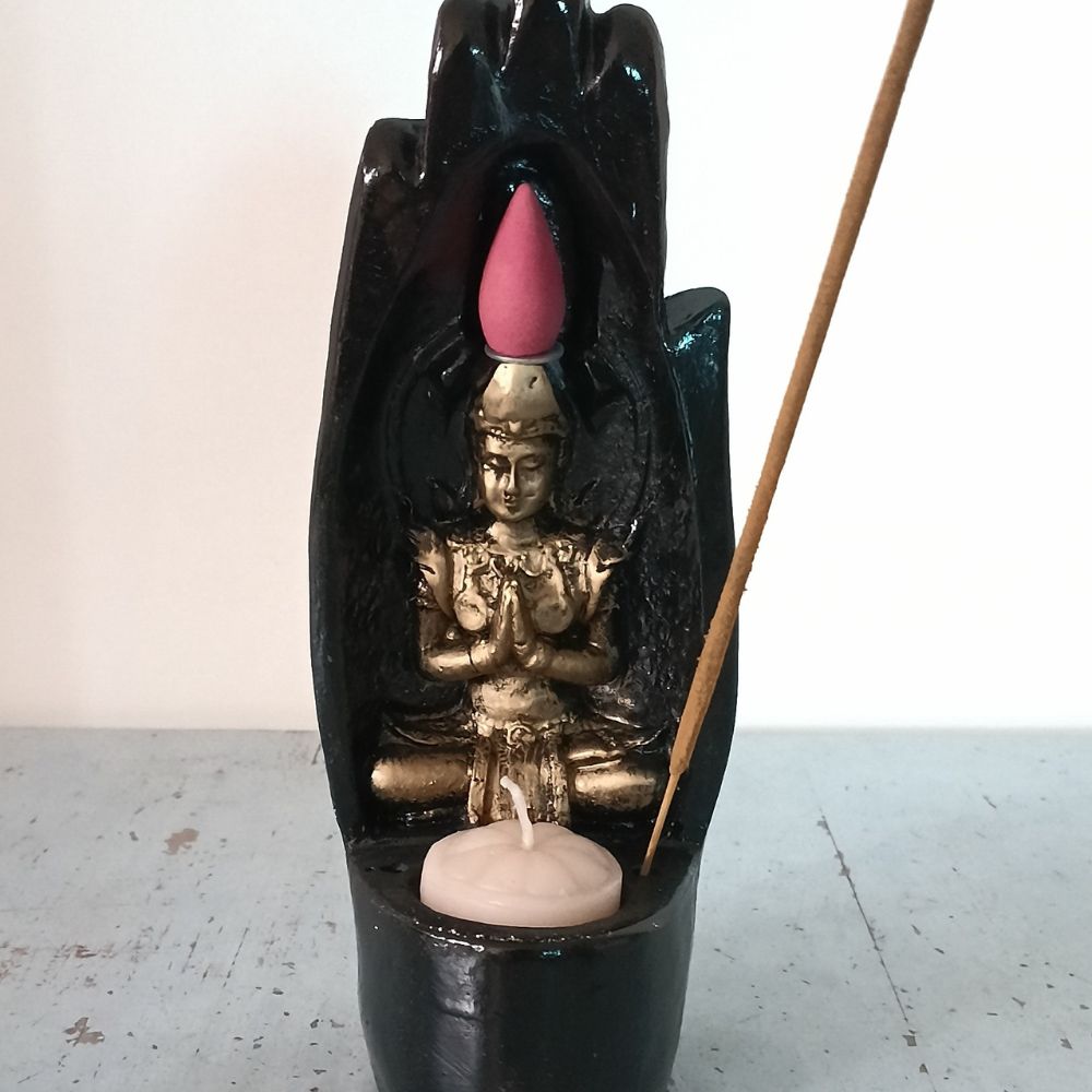 Al encender el cono de incienso, el humo fluye suavemente alrededor del Buda, simbolizando el equilibrio entre cuerpo, mente y espíritu. Ideal para meditar, limpiar energías o armonizar espacios sagrados.